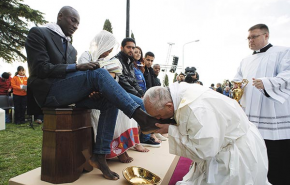 Tizenegy menekült és egy segélymunkás lábát mosta és csókolta meg Ferenc pápa csütörtökön az utolsó vacsorára emlékezve Castelnuovo di Porto menekülttáborában.