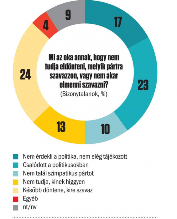 40 százalékuk nem akarja vagy nem tudja megmondani, hogy hatalomban tartaná-e a jelenlegi rezsimet vagy menesztené. Az aktív bizonytalanok másik csoportja – 39 százalék, körülbelül 350 ezer ember – elverekszi magát a szavazóurnákhoz, de titkolja, kit választ. Azt azonban lehet tudni, hogy ez utóbbi körnek 25 százaléka szeretné, ha folytatná az Orbán-kormány, viszont 56 százaléka új rezsimet akar, és csak 20 százalék nem tudja vagy nem mondja, hogy képzeli a következő ciklust.