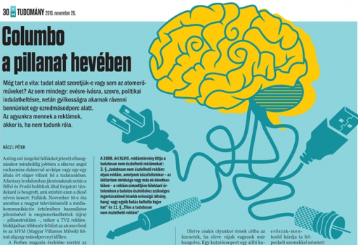 Columbo a pillanat hevében - Még tart a vita: tudat alatt szeretjük-e vagy sem az atomerőműveket? Az sem mindegy: evésre-ivásra, szexre, politikai indulatkeltésre, netán gyilkosságra akarnak rávenni bennünket egy ezredmásodperc alatt. Az agyunkra mennek a reklámok, akkor is, ha nem tudunk róla.