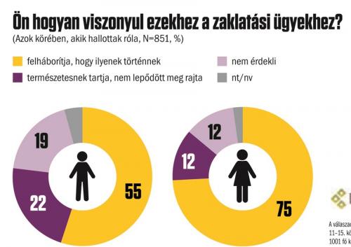 Nem egyformán háborítják fel a különböző végzettségű magyarokat a zaklatási történetek: a legkevésbé a diplomásokat (58 százalékukat), a legfeljebb nyolc általánost végzetteket pedig a leginkább (76 százalékukat). A szakmunkásokban és érettségizettekben ugyanolyan arányban keltettek negatív indulatokat a botrányok, a diplomások 24 százalékával szemben csak 18 százalék gondolta úgy mindkét csoportban, hogy természetesnek tartja az ilyen esetek előfordulását.