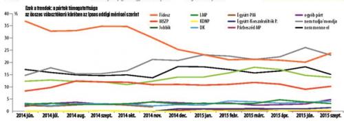 – Hát azért elég nagy különbség, hogy amíg például a balra sorolt intézetek 24 százalék körülre taksálták a Fidesz népszerűségét, a jobboldalra húzók javában 30 százalék fölé teszik.