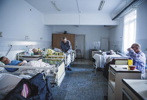 A kórház legnagyobb és egyetlen teljesen akadálymentesített kórtermében – amely egy polgári nappali méreteit hozza – 11 beteg fekszik. Ők azok, akik már nem mehetnek, nem tudnak visszamenni az utcára.