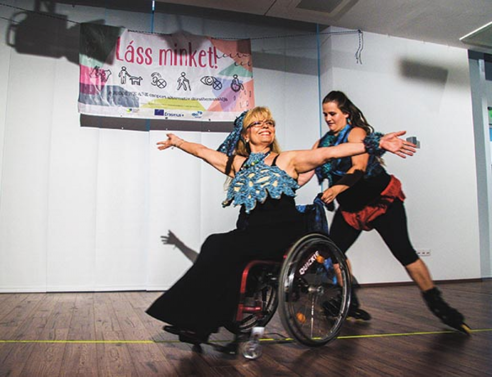 Az érzékenyítés másik fontos eleme, a láthatóvá tétel mellett, az együttműködés. Például, hogy miként segíthet egy elektromos székkel közlekedő ép társának a jövés-menésben, vagy hogyan támogathatják, egészíthetik ki egymást azok, akik nem ugyanazzal a képességhiánnyal élnek. Eszter például görkorit vetett be az alternatív divatbemutatón, hogy megmutassa, mennyivel akadálymentesebben zajlik egy kerekes székes-görkorcsolyás pas de deux, milyen klasszul meg lehet forgatni a székben ülő freestyle versenytáncost, vagy épp mekkora szolgálatot tehet nekünk elektromos székes társunk, ha engedi, hogy belé kapaszkodjunk.