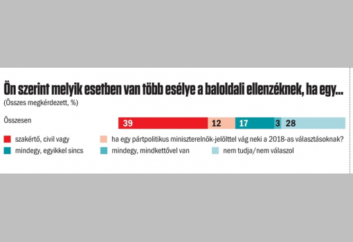 A közvélemény-kutatás alapkérdése azt firtatta, van-e esélye a baloldalnak, hogy megnyerje a választásokat – függetlenül attól, hogy ki (értsd: politikus vagy közéleti szereplő) a miniszterelnök- jelölt. Nincs – így véli az emberek mintegy fele. Csakhogy ez alapvetően a Fidesz-, illetve a Jobbik-hívek válasza: e két tábor 68 és 67 százaléka nem hisz abban, hogy a baloldal kormányt dönthet.
