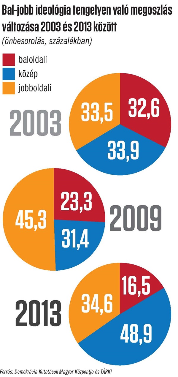 – A baloldal nagyon nehéz helyzetben van ilyen szempontból is. Míg egykor stabilan ehhez az oldalhoz köthető érték volt például az állam szerepének kihangsúlyozása – mondván, Kádár gyermekei vagyunk mind –, legutóbb már egy technokrata jellegű, kevésbé az állam támogató szerepére koncentráló kormányzást láttunk. Így viszont azok a szavazók, akik az államra tekintettek, elvesztek. Erre utal például az, hogy a magukat baloldaliaknak vallók aránya jelentősen csökkent az elmúlt tíz évben.