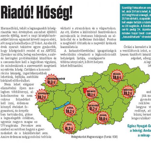 Harmadfokú, tehát a legmagasabb hőségriasztás van érvényben szombat éjféltől szerda éjfélig, mert a napi középhőmérséklet három egymást követő napon eléri, sőt meg is haladhatja a 27 fokot. Az elmúlt évek nyarait tekintve egyre gyakoribb, hogy hőségriadót rendel el az ÁNTSZ. Ilyenkor az idős, beteg emberekre, a szívés keringési problémákkal küzdőkre és a csecsemőkre kell a legjobban vigyázni, de mindenkinek a szervezetét megviseli az extrém hőség. Csökken a koncentrációs készség, ingerlékenyebbek lehetünk, fejfájás, szédülés bárkinél előfordulhat.