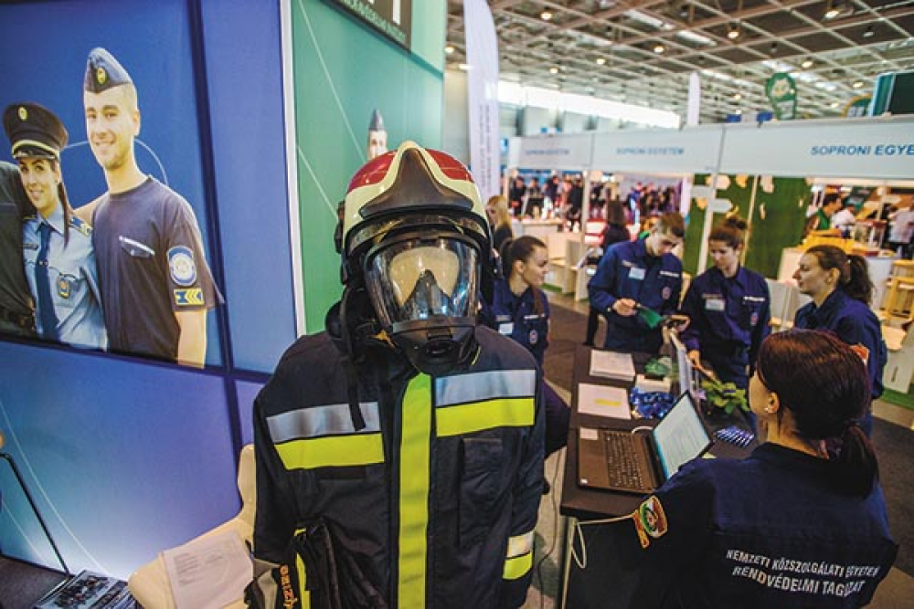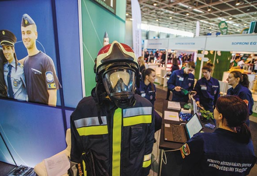 A kiállításon a továbbtanuló diákok csaknem 50 felsőoktatási intézmény kínálatát ismerhetik meg (képünkön a Nemzeti Közszolgálati Egyetem standja), emellett nyelvtanulásról és a külföldi tanulás lehetőségeiről is számos kiállítónál tájékozódhatnak.