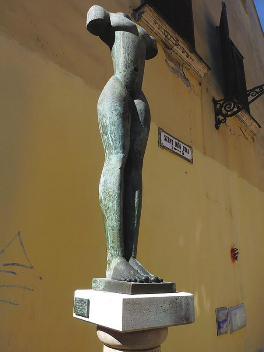 Taubert László A kicsi című férfi akttorzója például, melyet 1995-ben adományozott a városnak a művész, jó ideje meredező fallosz nélkül ácsorog a Szent Mór utca és a Király utca sarkán. Annak idején eléggé megosztotta, sőt sok esetben zavarba is hozta a közvéleményt, hogy akár akarják, akár nem, egy akasztó formájú, az utca felé meredő hímtag mellett kell elsétálniuk jártukban-keltükben. Aztán jött valaki egy csillag- és holdfénymentes, sötét éjjelen, és megkegyelmezett a prűd lakóknak: letörte A kicsi nem is olyan kicsi falloszát, melyet a város „jobb a békesség” alapon nem enged helyreállítani. Végül is a szobor így is szép, és még jobban is illik a mai gendersemleges világba.