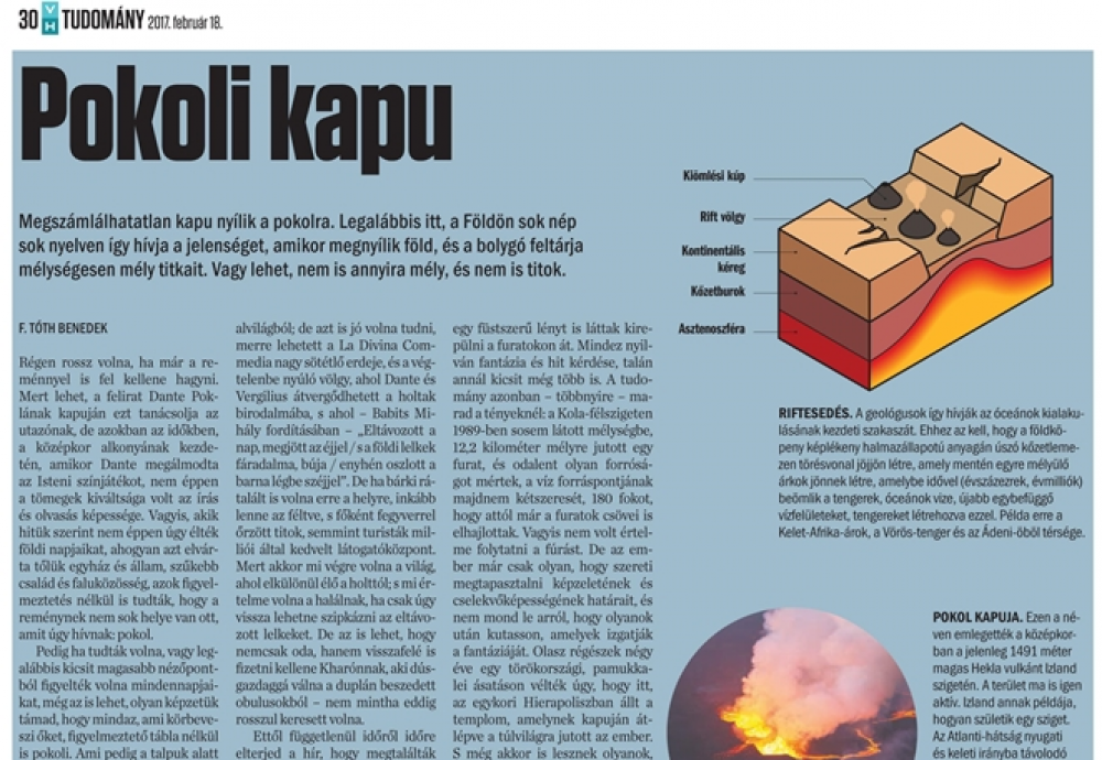 És ha azt gondolnánk, hogy tényleg olyan egyszerű volna a földi, kézzel fogható dolgoknál maradni akkor, amikor a hírek pokolra nyíló kapukról szólnak, álljon itt egy történet a nem is olyan régmúltból: a múlt század utolsó negyedének hajnalán az oroszok állítólag olyan mélyre fúrtak a föld alá, hogy elérték a poklot. Mit elérték, mikrofont engedtek a mélybe, és döbbenetes hangokat hallottak feltörni több mint 9 ezer méteres mélységből: emberi sikolyok sokaságát, és akadtak olyanok is, akik egy füstszerű lényt is láttak kirepülni a furatokon át. Mindez nyilván fantázia és hit kérdése, talán annál kicsit még több is. A tudomány azonban – többnyire – marad a tényeknél: a Kola-félszigeten 1989-ben sosem látott mélységbe, 12,2 kilométer mélyre jutott egy furat, és odalent olyan forróságot mértek, a víz forráspontjának majdnem kétszeresét, 180 fokot, hogy attól már a furatok csövei is elhajlottak. Vagyis nem volt értelme folytatni a fúrást. De az ember már csak olyan, hogy szereti megtapasztalni képzeletének és cselekvőképességének határait, és nem mond le arról, hogy olyanok után kutasson, amelyek izgatják a fantáziáját. Olasz régészek négy éve egy törökországi, pamukkalei ásatáson vélték úgy, hogy itt, az egykori Hierapoliszban állt a templom, amelynek kapuján átlépve a túlvilágra jutott az ember.