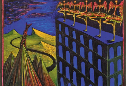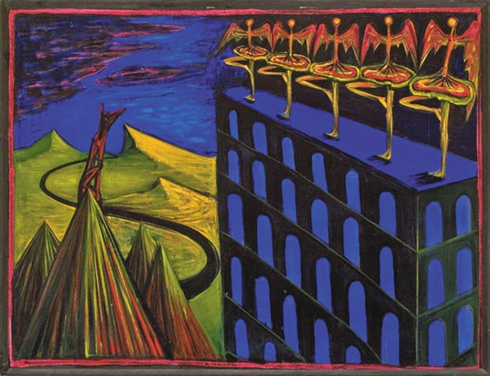 Az arctalan szárnyas torzók, ókori mitológiai alakok, a párkák mellett balerinák, hattyúk testesítik meg ezeket a vágyott ideálokat, a női testbe született, de nemi identitásával folyamatosan harcban álló művészt pedig általában a kutya alakja szimbolizálja az élénk, jellegzetes színvilágú festményeken. Amelyek mind egyfajta önálló, személyes mítoszrendszerben értelmezhetőek igazán – a kétteremnyi festmény éppen elég ahhoz, hogy megtanuljunk „tájékozódni” ebben a sajátos, szimbólumokkal teletűzdelt világban. Hogy aztán az utolsó teremben Raum Attila Bevezető leckék című 1997-es filmjén keresztül belepillanthassunk a művész, egykoron évente megrendezett, Dzsan Panoptikumnak nevezett performanszába is, ahol El Kazovszkij egyfajta ceremóniamesterként irányítja a történéseket, alkotja meg bálványait az élő szereplők részvételével is.
