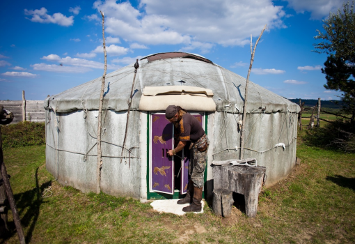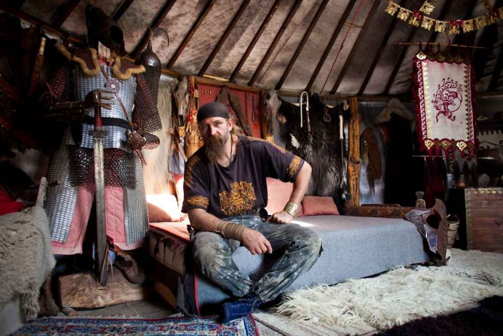 Egy kör alakú, tizenkét méter átmérőjű, vaskori ház belseje tárul elém. Hat éve él itt kedvesével. Előtte nomád jurtában laktak. Lépdelek a döngöletlen földön, a tapasztott agyagfal szűk ablaknyílásain beszűrődik a fény, halványan sejtetve a falra festett, szkíta motívumokat. Középen nagy, kőből rakott szabad tűzhely, az épület hatalmas belső körén tizenhárom csupasz faoszlop, pontosan annyi, ahány holdhónapból egy év áll. Tetejükön több méter magasan pajzsok és lókoponyák.