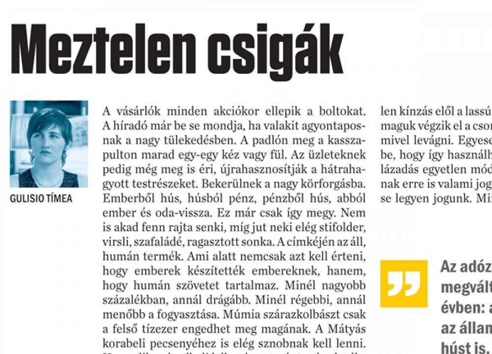 Emberből hús, húsból pénz, pénzből hús, abból ember és oda-vissza. Ez már csak így megy. Nem is akad fenn rajta senki, míg jut neki elég stifolder, virsli, szafaládé, ragasztott sonka. A címkéjén az áll, humán termék. Ami alatt nemcsak azt kell érteni, hogy emberek készítették embereknek, hanem, hogy humán szövetet tartalmaz. Minél nagyobb százalékban, annál drágább. Minél régebbi, annál menőbb a fogyasztása. Múmia szárazkolbászt csak a felső tízezer engedhet meg magának. A Mátyás korabeli pecsenyéhez is elég sznobnak kell lenni.