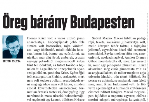 Az utcákon már alig jártak emberek, csupán egy-egy petárdától megzavarodott kutya tűnt fel időnként, és futott tovább a hajnalon át. Legalább ne ünnepelnénk olyan szolgalelkűen, gondolta Krisz. Egész éjjel teát osztogatott a Blahán, csak azért, mert nem volt kedve se bulizni, se aludni, olvasni meg egy ideje nem volt képes, minden szónál követhetetlen asszociációk, formátlan érzések törtek rá, émelygésig. Egy nercbundás maca tűsarkú bokacsizmájával rugdosott egy Lexust, dühösen Kriszre pillantott, és ráüvöltött: ne hívj rendőrt, hülye spicli, ez az én kocsim, csak a kibaszott kulcsa nincs sehol. Krisz az épp ott álldogáló Radnóti-szoborra pillantott, vajon ehhez mit szól az öreg bárány. Pár méterre a dühöngő 1 százaléktól, a fagyos aszfalton kulcscsomót vett észre. Elpasszolgatott vele az első csatornafedélig, ott szép lassan, hogy billegjen, de még épp ne essen bele, a kulcscsomót megállította.