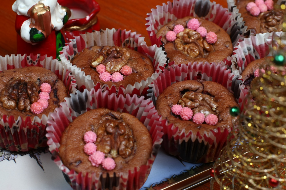 Recept: 10 dkg olvasztott vajat egy kis kakaóporral összekeverünk. Felhabosítunk 2 db tojást 10 dkg kristálycukorral, majd belekeverjük a kakaós vajba. Hozzáadunk 15 dkg lisztet és egy zacskó sütőport, majd a masszába keverjük a diót, és a cseresznyét. A kis papír muffin tartókat megtömjük egy-egy nagy kanállal, dióval díszítjük. 12 db muffinunk lesz, melyeket 175 fokon, 25 percig sütünk.