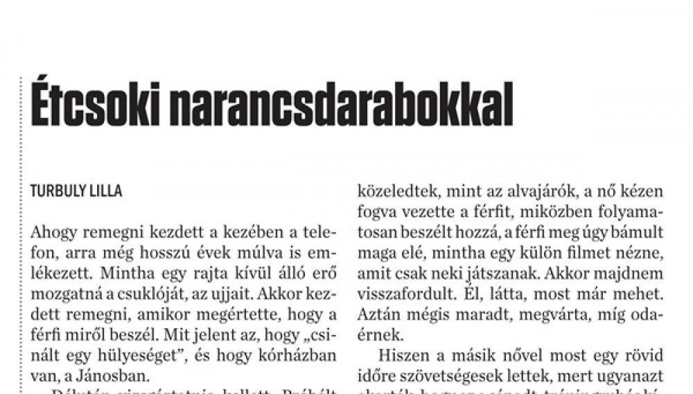 Délután vizsgáztatnia kellett. Próbált figyelni, bólogatni vagy legalább eljátszani a figyelmes és jóindulatú vizsgáztatót, miközben egyre az dobolt benne, hogy legyen már vége, és mehessen hozzá, mert nem volt elég a hangja, muszáj látni, hogy él. A villamos felé futtában beugrott egy kisboltba, de fogalma sem volt, mit kéne vinni valakinek, aki két napja úgy döntött, hogy neki már semmire sincs szüksége ebből a világból. Végül vett pár mandarint meg egy tábla étcsokit narancsdarabokkal.