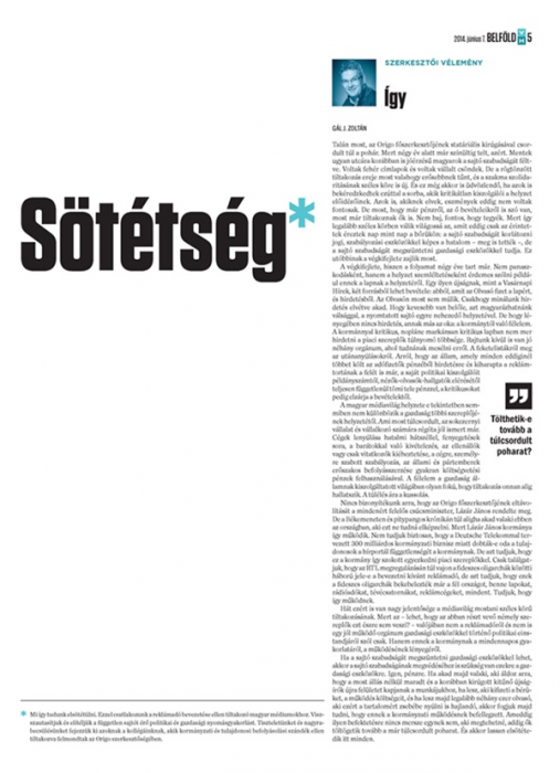 Nincs bizonyítékunk arra, hogy az Origo főszerkesztőjének eltávolítását a mindenért felelős csúcsminiszter, Lázár János rendelte meg. De a Békemeneten és pitypangos krónikán túl aligha akad valaki ebben az országban, aki ezt ne tudná elképzelni. Mert Lázár János kormánya így működik. Nem tudjuk biztosan, hogy a Deutsche Telekommal tervezett 300 milliárdos kormányzati biznisz miatt dobták-e oda a tulajdonosok a hírportál függetlenségét a kormánynak. De azt tudjuk, hogy ez a kormány így szokott egyezkedni piaci szereplőkkel. Csak találgatjuk, hogy az RTL megregulázásán túl vajon a fideszes oligarchák közötti háború jele-e a bevezetni kívánt reklámadó, de azt tudjuk, hogy ezek a fideszes oligarchák bekebelezték már a fél országot, benne lapokat, rádióadókat, tévécsatornákat, reklámcégeket, mindent. Tudjuk, hogy így működnek.