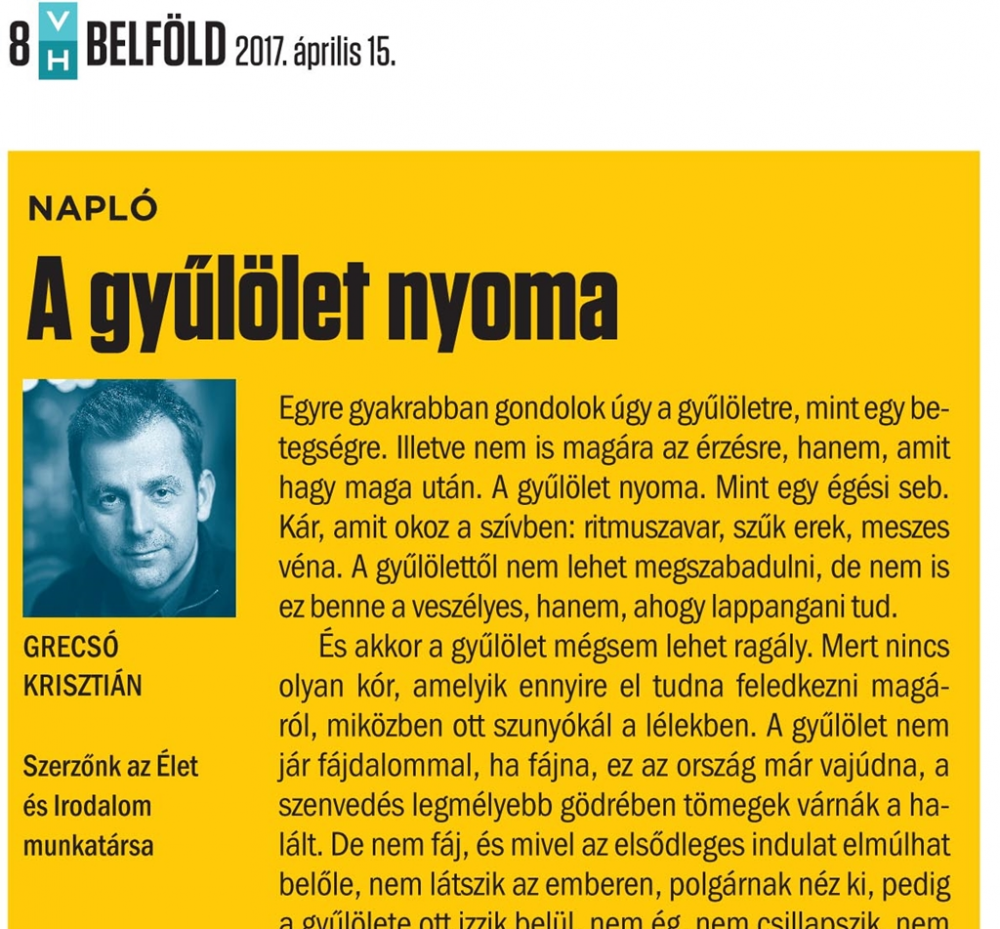 Egyre gyakrabban gondolok úgy a gyűlöletre, mint egy betegségre. Illetve nem is magára az érzésre, hanem, amit hagy maga után. A gyűlölet nyoma. Mint egy égési seb. Kár, amit okoz a szívben: ritmuszavar, szűk erek, meszes véna. A gyűlölettől nem lehet megszabadulni, de nem is ez benne a veszélyes, hanem, ahogy lappangani tud. És akkor a gyűlölet mégsem lehet ragály. Mert nincs olyan kór, amelyik ennyire el tudna feledkezni magáról, miközben ott szunyókál a lélekben. A gyűlölet nem jár fájdalommal, ha fájna, ez az ország már vajúdna, a szenvedés legmélyebb gödrében tömegek várnák a halált.