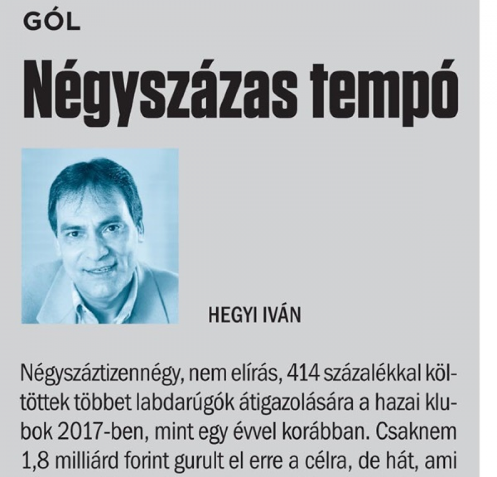 Négyszáztizennégy, nem elírás, 414 százalékkal költöttek többet labdarúgók átigazolására a hazai klubok 2017-ben, mint egy évvel korábban. Csaknem 1,8 milliárd forint gurult el erre a célra, de hát, ami könnyen jön, az könnyen megy, hiszen a fedezetet kitermelni nem kell, a számla döntő hányadát az állam állja. A központi pénzek elszórása meg senkinek se fáj; mármint a berkeken belül nem hasogat, aki pedig kívül van a körökön, az úgysem érdekes.