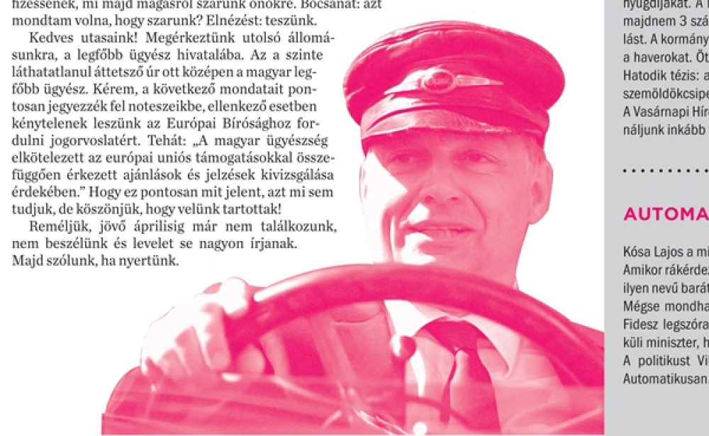 Kedves utasaink! Megérkeztünk utolsó állomásunkra, a legfőbb ügyész hivatalába. Az a szinte láthatatlanul áttetsző úr ott középen a magyar legfőbb ügyész. Kérem, a következő mondatait pontosan jegyezzék fel noteszeikbe, ellenkező esetben kénytelenek leszünk az Európai Bírósághoz fordulni jogorvoslatért. Tehát: „A magyar ügyészség elkötelezett az európai uniós támogatásokkal összefüggően érkezett ajánlások és jelzések kivizsgálása érdekében.” Hogy ez pontosan mit jelent, azt mi sem tudjuk, de köszönjük, hogy velünk tartottak!