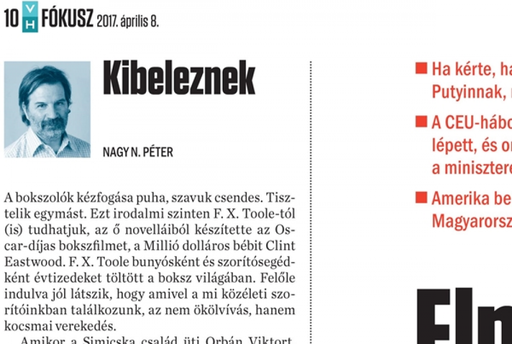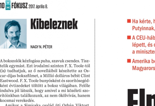Nagy N. Péter: "Kibeleznek" című cikke a friss VH-ban a témát elemző összeállításunk ("Elmenni a falig" - és Gerlóczy Máton: Április 4.) mellett jelent meg.