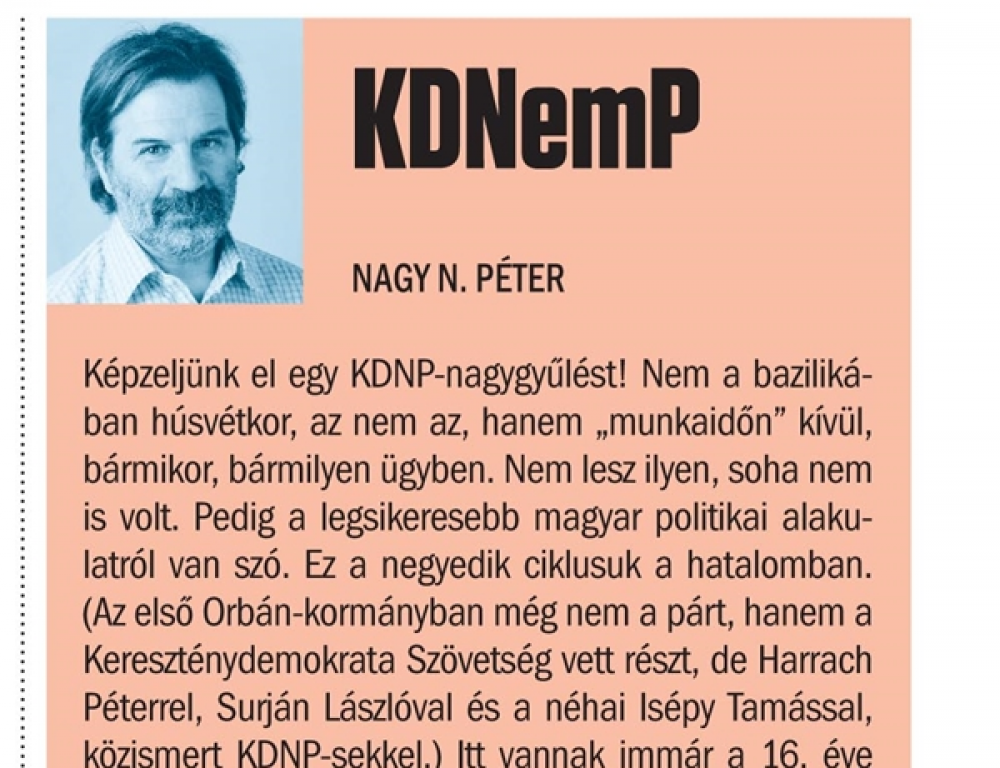 Képzeljünk el egy KDNP-nagygyűlést! Nem a bazilikában húsvétkor, az nem az, hanem „munkaidőn” kívül, bármikor, bármilyen ügyben. Nem lesz ilyen, soha nem is volt. Pedig a legsikeresebb magyar politikai alakulatról van szó. Ez a negyedik ciklusuk a hatalomban.