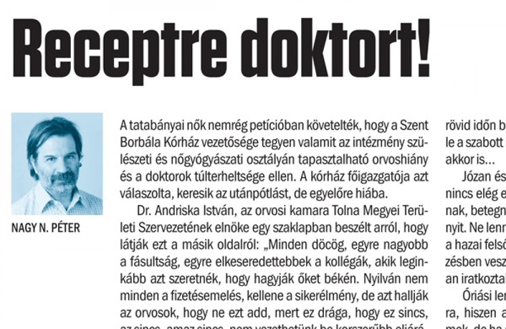 A tatabányai nők nemrég petícióban követelték, hogy a Szent Borbála Kórház vezetősége tegyen valamit az intézmény szülészeti és nőgyógyászati osztályán tapasztalható orvoshiány és a doktorok túlterheltsége ellen. A kórház főigazgatója azt válaszolta, keresik az utánpótlást, de egyelőre hiába.