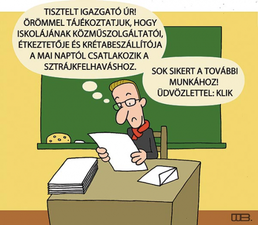 - Tisztelt igazgató úr! Örömmel tájékoztatjuk, hogy iskolájának közműszolgáltatói, étkeztetője és krétabeszállítója a mai naptól csatlakozik a sztrájkfelhíváshoz.