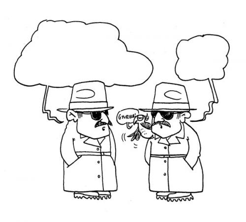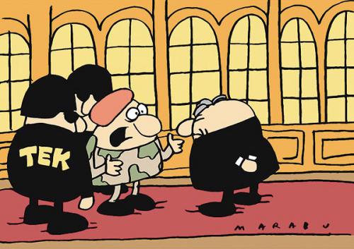 – Mi hoznánk az eredményeket, főnök, de az a baj, hogy nemcsak mi titkosítjuk a terrorvészhelyzetet, hanem ezek a ravasz terroristák is! MARABU rajza